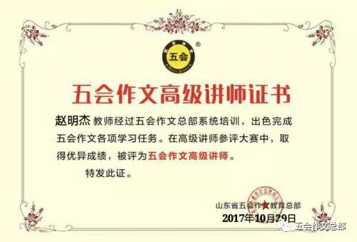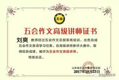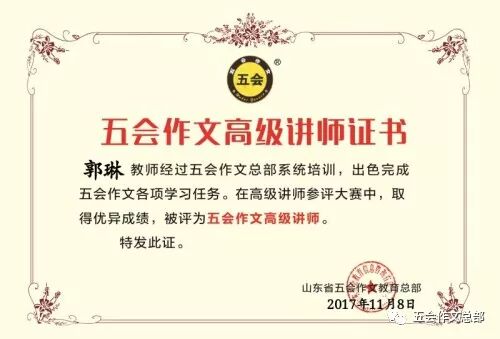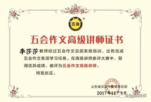 在五会作文总部举办的2017年****期全国五会作文高级讲师大赛中成绩突出,被评为五会作文高级讲师。