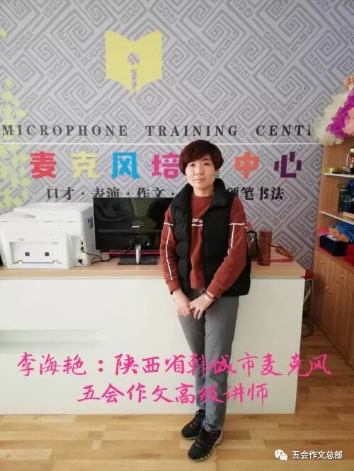 李海艳老师简介:今年36岁。本人性格开朗,做事有责任心,具有进取精神和团队精神,有较强的协调沟通能力。喜欢看书,唱歌,跳舞。于2016年5月加入山东省五会作文这个大家庭。现就职于陕西省韩城市麦克风培训中心,在职期间,工作积极认真,得到家长以及学生的认可。在五会作文总部举办的2017年****期全国五会作文高级讲师大赛中成绩突出,被评为五会作文高级讲师。
