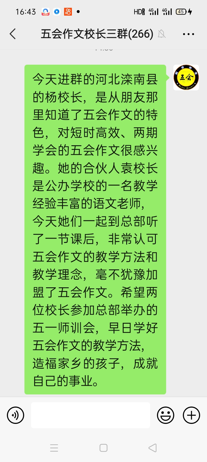 喜讯:****五会大家庭又添新成员,欢迎河北省滦南县的杨校长加盟五会作文!